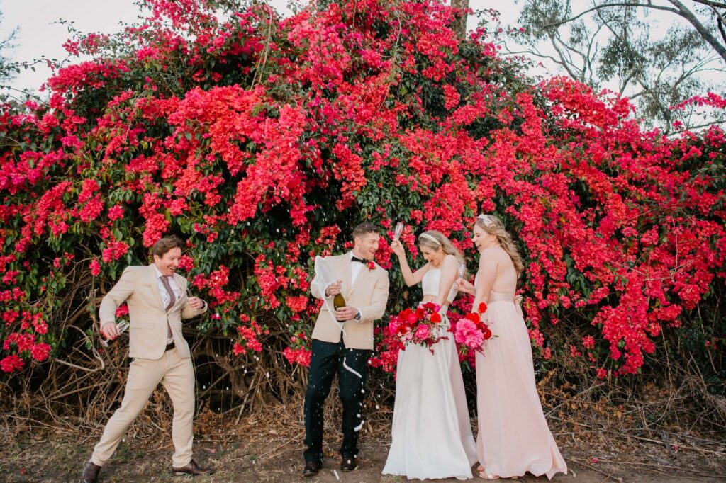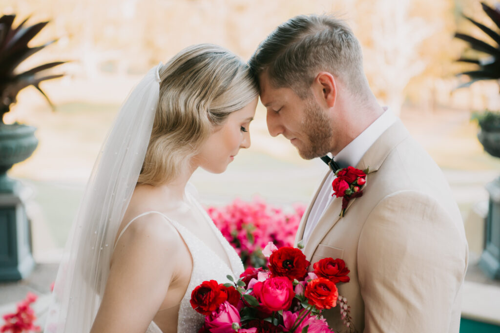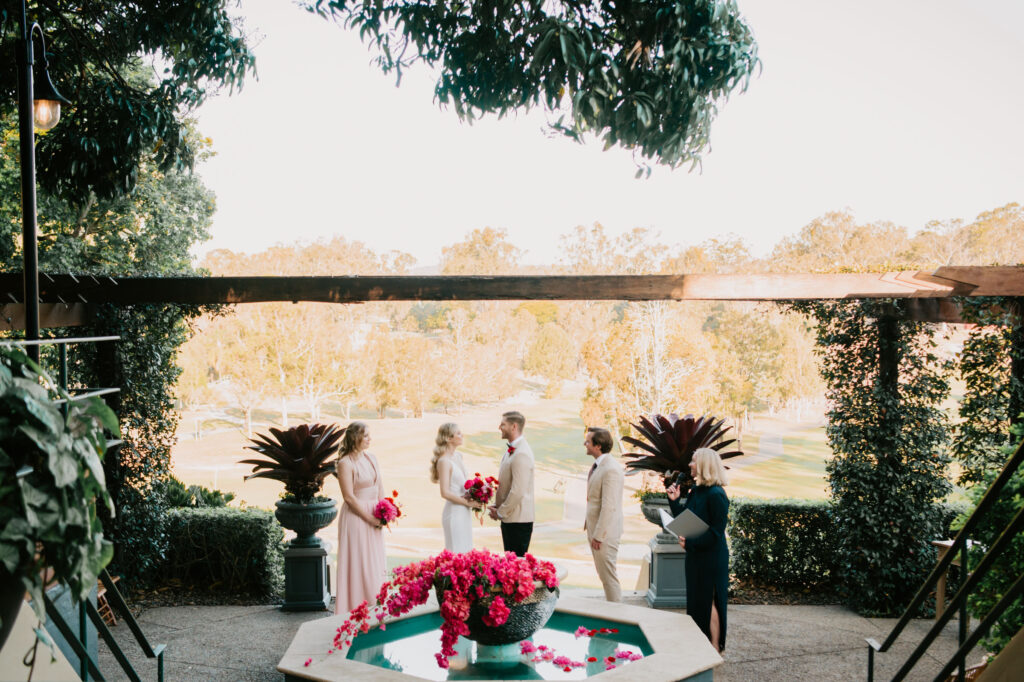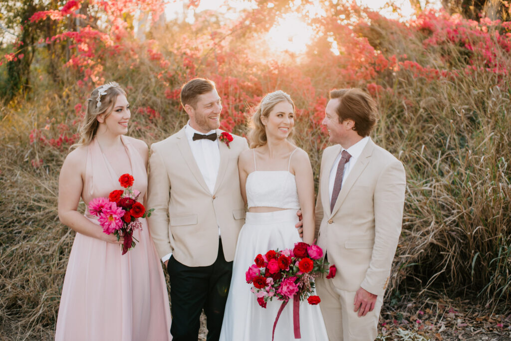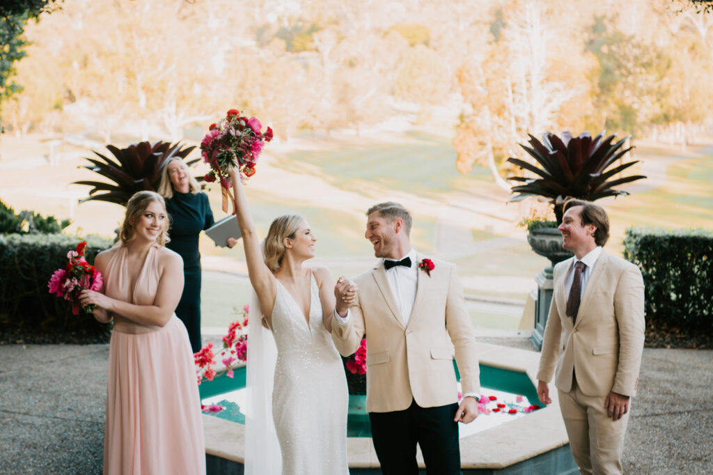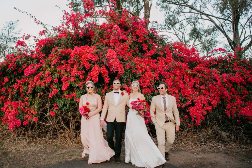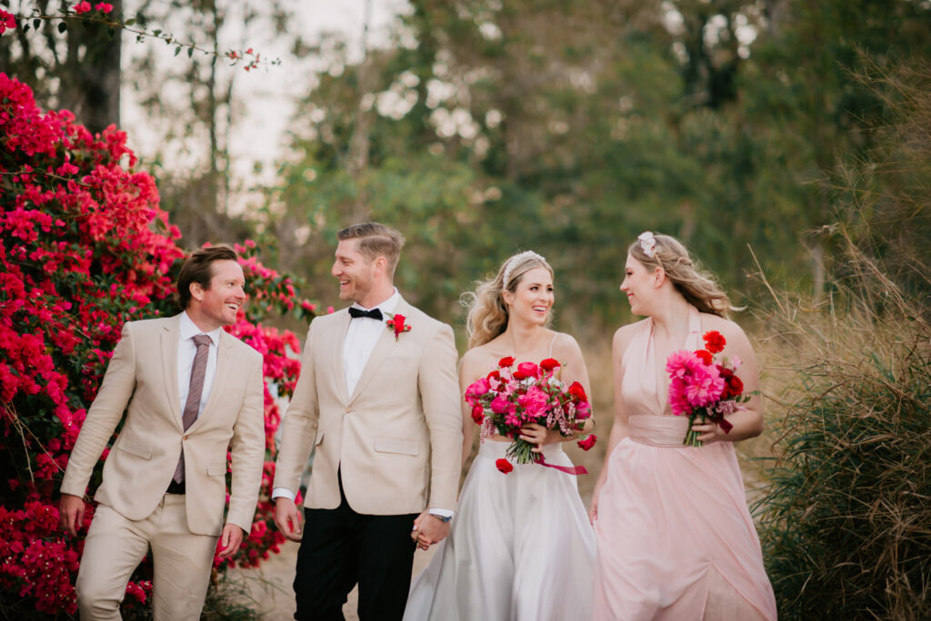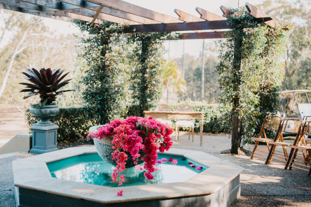 Honouring Hillstone St Lucia’s stunning seasonal pink bougainvillea within its grounds, this team was all about showcasing all things feminine, whimsical and romantic. They were also inspired by the elegance of the venue’s unique ceremony and reception spaces. The bride and bridesmaid were dressed in modern and sophisticated beaded gowns sourced from local designer, When Freddie Met Lilly. Their look was adorned with stunning headpieces by The Little Pack of Five. Hair and makeup artist, Bella Brides created a soft and romantic look that embodied the elegance of the shoot. The groom and groomsmen were impeccably dressed in cream suits, also by When Freddie Met Lilly. Held at the Fountain area, the ceremony space was adjourned with pink bougainvillea which cascaded down the fountain and into the water. The bridal party was framed by a stunning collection of blooms with bright pink and red tones. Brisbane City Celebrants brought a beautiful energy and elegance to the ceremony.After the ceremony, the bridal party enjoyed some champagne fun wandering the grounds amongst the wall of bougainvillea. Afterwards, Emunah Events designed a romantic and elegant reception space at The Mango Tree Terrace. It included a beautifully adorned long table under the tree, complete with fairy lights and candles, a pastel floral runner, gold cutlery and gold trim dinnerware. It was a feast for the eyes! The stunning three tier wedding cake, by The Sweet Society Co, was simply striking and adorned with hand made pink bougainvillea petals.We Are Twine’s light and bright imagery was captured with a modern and joyful romance. The team was able to honour the stunning spaces at Hillstone St Lucia along side it’s homage to the pink bougainvillea featured at this time of year.