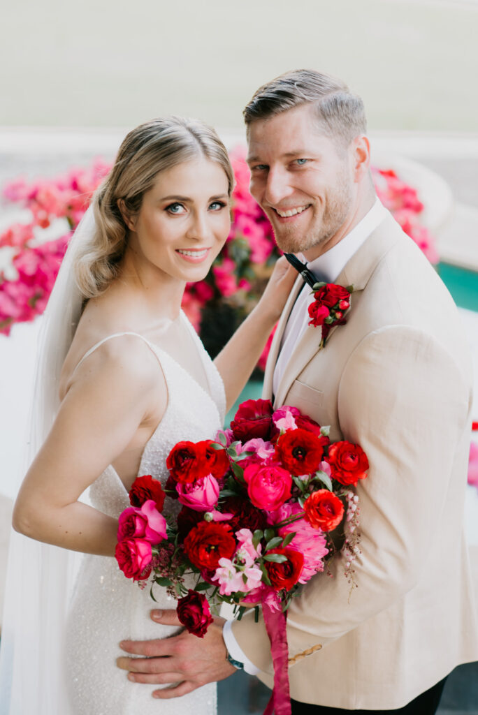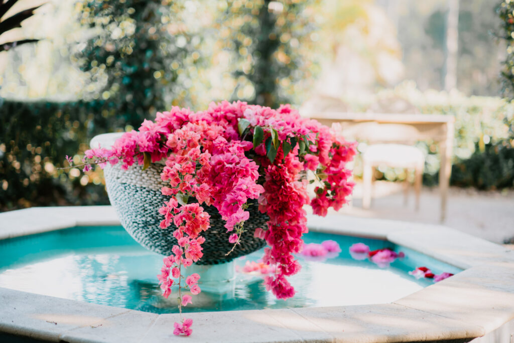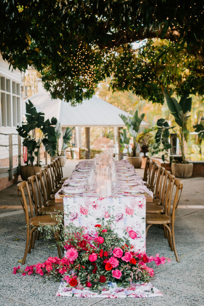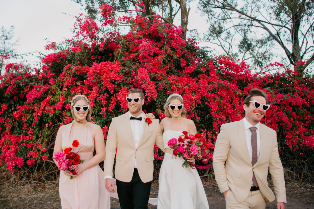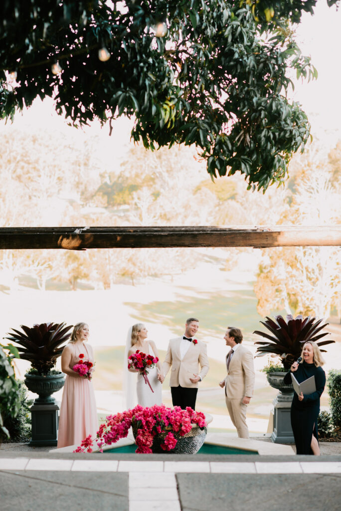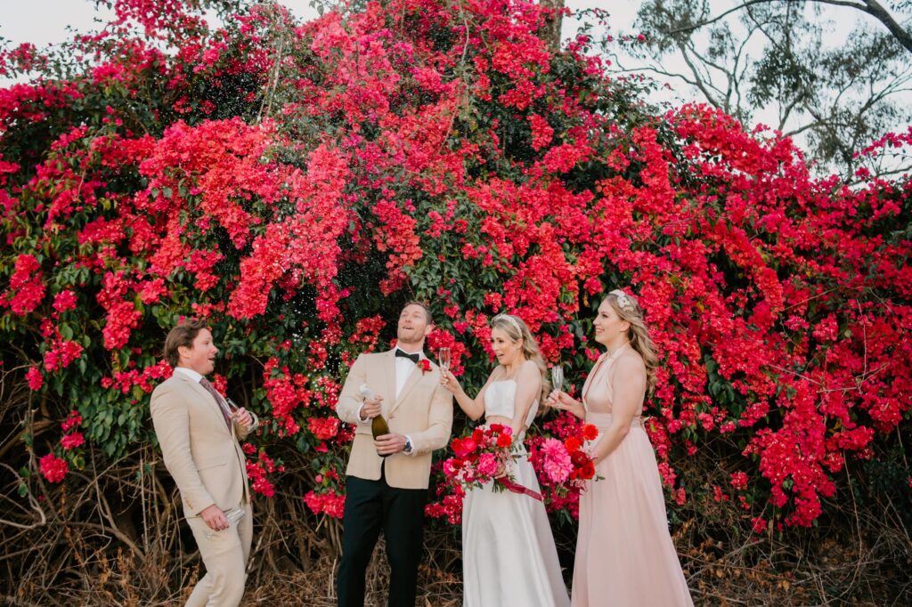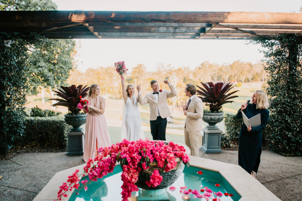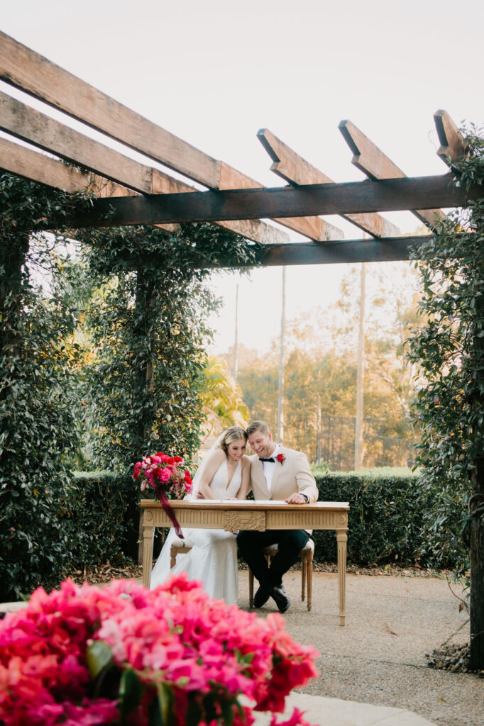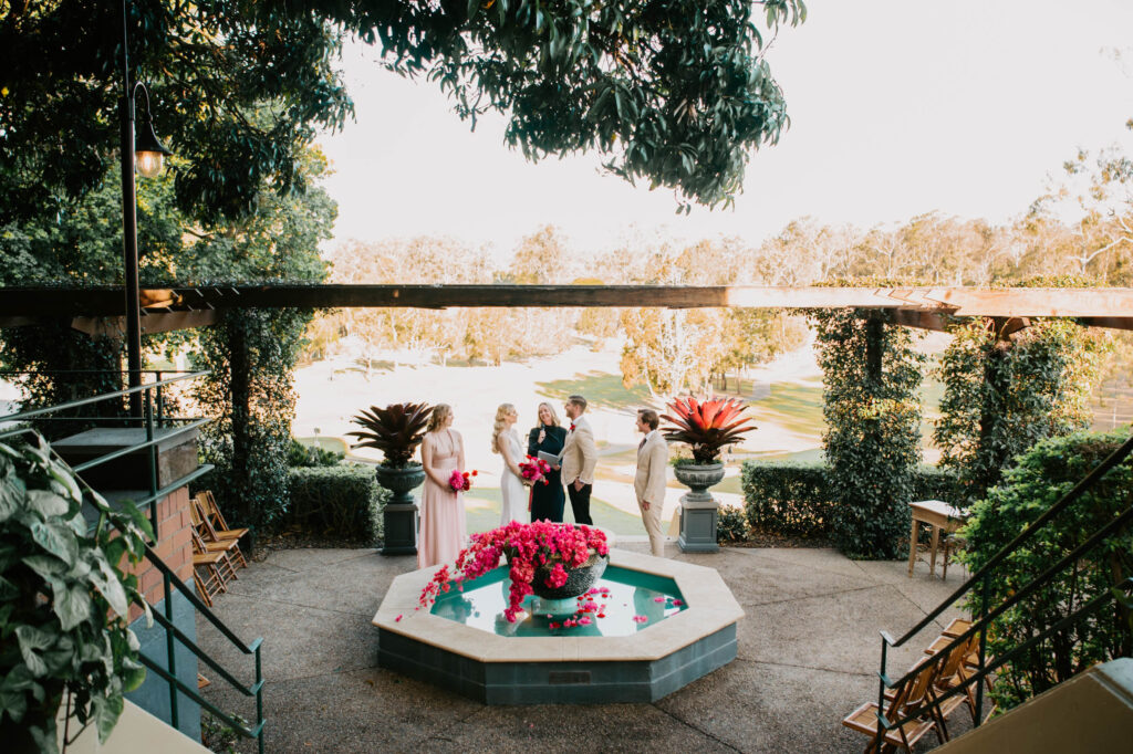Honouring Hillstone St Lucia’s stunning seasonal pink bougainvillea within its grounds, this team was all about showcasing all things feminine, whimsical and romantic. They were also inspired by the elegance of the venue’s unique ceremony and reception spaces. The bride and bridesmaid were dressed in modern and sophisticated beaded gowns sourced from local designer, When Freddie Met Lilly. Their look was adorned with stunning headpieces by The Little Pack of Five. Hair and makeup artist, Bella Brides created a soft and romantic look that embodied the elegance of the shoot. The groom and groomsmen were impeccably dressed in cream suits, also by When Freddie Met Lilly. Held at the Fountain area, the ceremony space was adjourned with pink bougainvillea which cascaded down the fountain and into the water. The bridal party was framed by a stunning collection of blooms with bright pink and red tones. Brisbane City Celebrants brought a beautiful energy and elegance to the ceremony.After the ceremony, the bridal party enjoyed some champagne fun wandering the grounds amongst the wall of bougainvillea. Afterwards, Emunah Events designed a romantic and elegant reception space at The Mango Tree Terrace. It included a beautifully adorned long table under the tree, complete with fairy lights and candles, a pastel floral runner, gold cutlery and gold trim dinnerware. It was a feast for the eyes! The stunning three tier wedding cake, by The Sweet Society Co, was simply striking and adorned with hand made pink bougainvillea petals.We Are Twine’s light and bright imagery was captured with a modern and joyful romance. The team was able to honour the stunning spaces at Hillstone St Lucia along side it’s homage to the pink bougainvillea featured at this time of year.