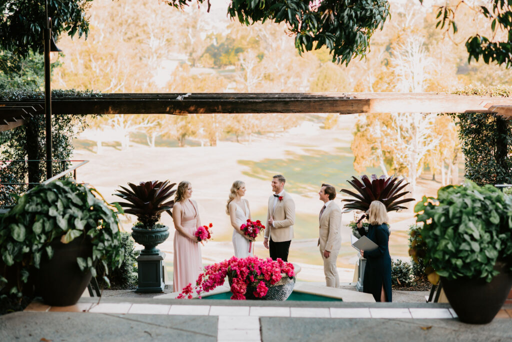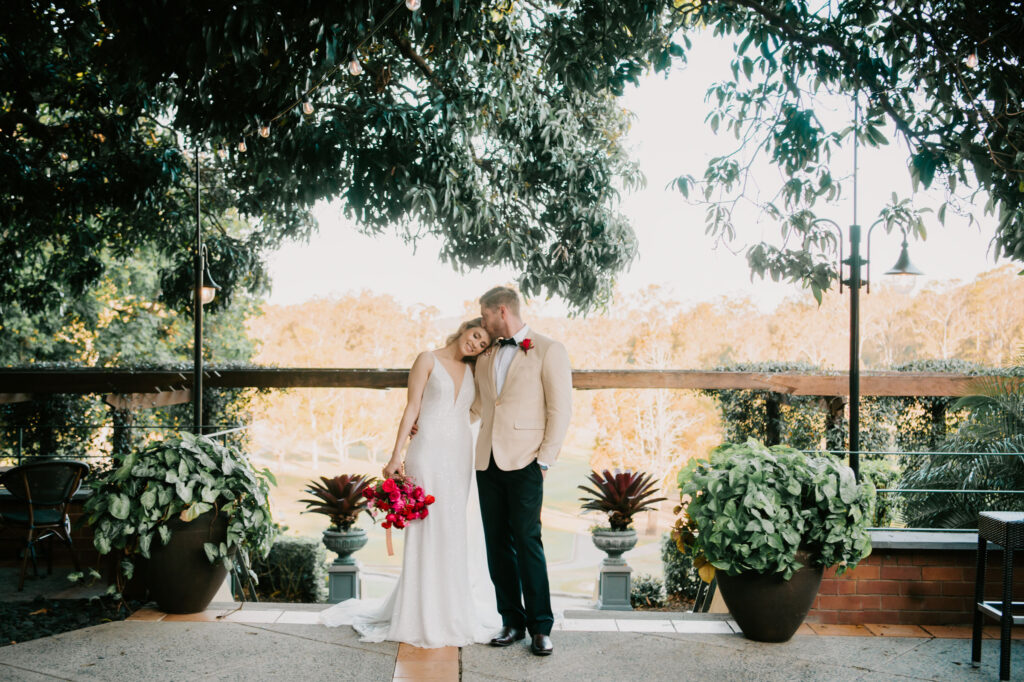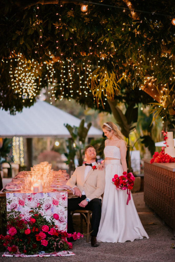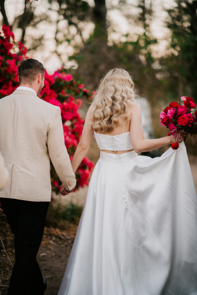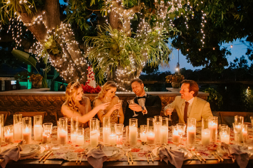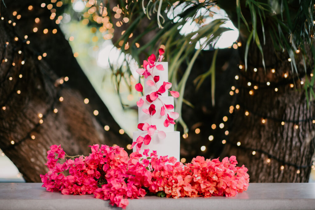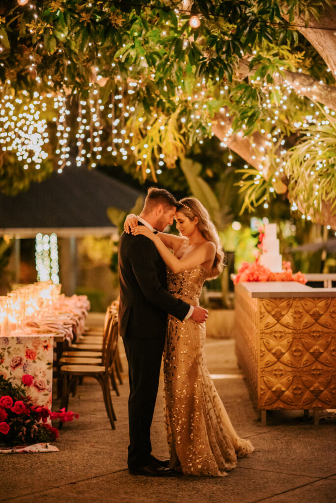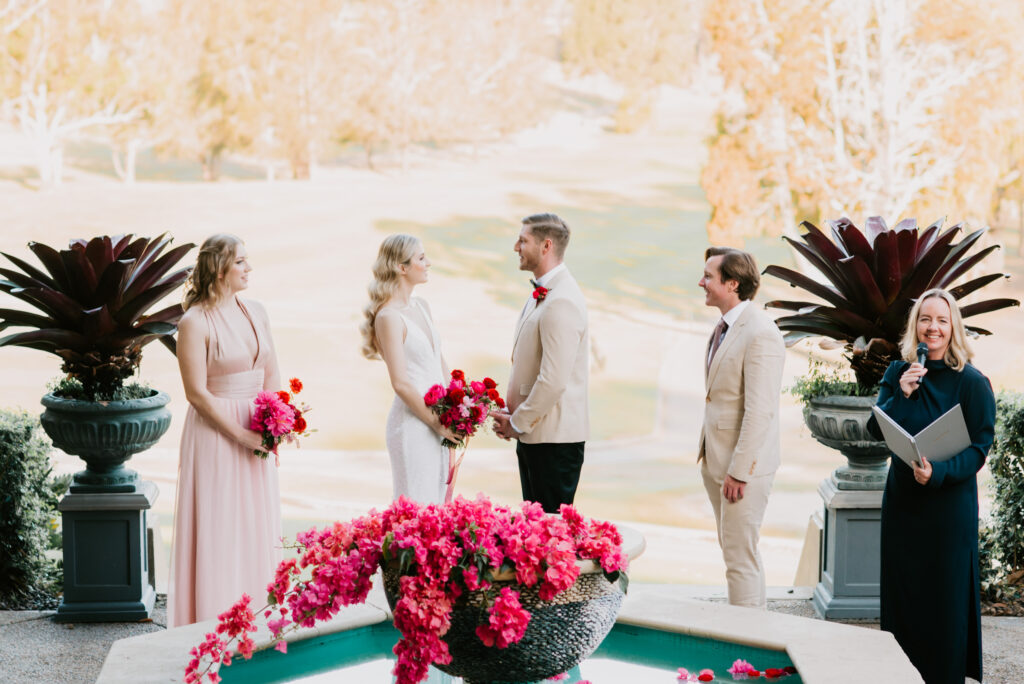 Honouring Hillstone St Lucia’s stunning seasonal pink bougainvillea within its grounds, this team was all about showcasing all things feminine, whimsical and romantic. They were also inspired by the elegance of the venue’s unique ceremony and reception spaces. The bride and bridesmaid were dressed in modern and sophisticated beaded gowns sourced from local designer, When Freddie Met Lilly. Their look was adorned with stunning headpieces by The Little Pack of Five. Hair and makeup artist, Bella Brides created a soft and romantic look that embodied the elegance of the shoot. The groom and groomsmen were impeccably dressed in cream suits, also by When Freddie Met Lilly. Held at the Fountain area, the ceremony space was adjourned with pink bougainvillea which cascaded down the fountain and into the water. The bridal party was framed by a stunning collection of blooms with bright pink and red tones. Brisbane City Celebrants brought a beautiful energy and elegance to the ceremony.After the ceremony, the bridal party enjoyed some champagne fun wandering the grounds amongst the wall of bougainvillea. Afterwards, Emunah Events designed a romantic and elegant reception space at The Mango Tree Terrace. It included a beautifully adorned long table under the tree, complete with fairy lights and candles, a pastel floral runner, gold cutlery and gold trim dinnerware. It was a feast for the eyes! The stunning three tier wedding cake, by The Sweet Society Co, was simply striking and adorned with hand made pink bougainvillea petals.We Are Twine’s light and bright imagery was captured with a modern and joyful romance. The team was able to honour the stunning spaces at Hillstone St Lucia along side it’s homage to the pink bougainvillea featured at this time of year.