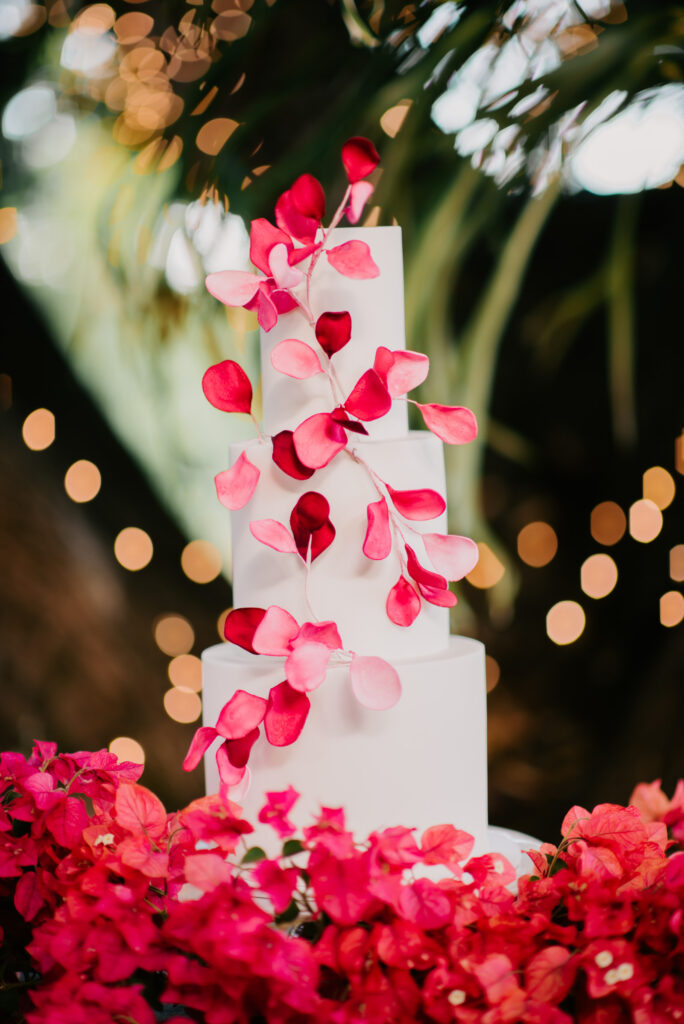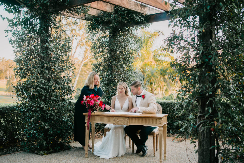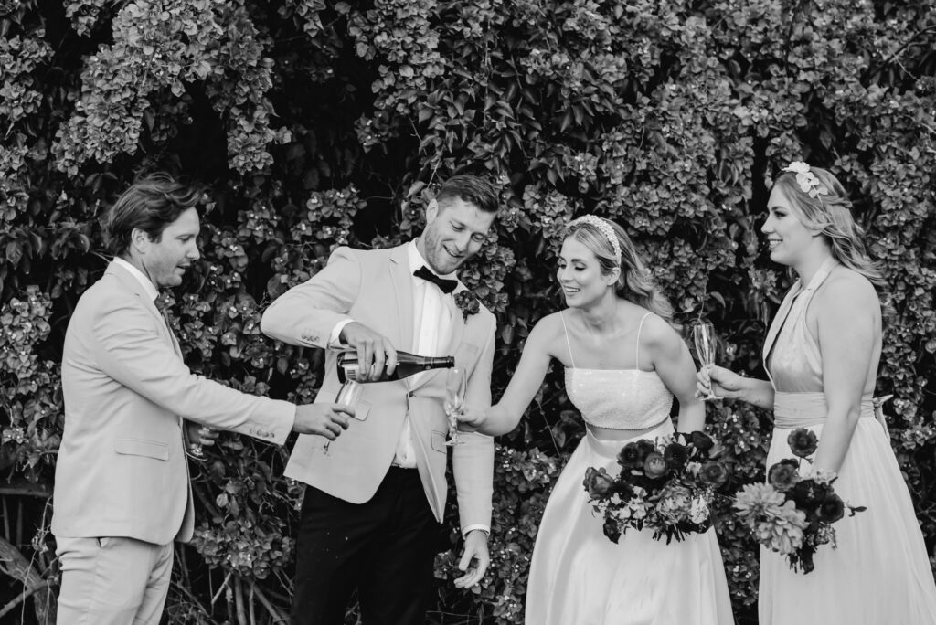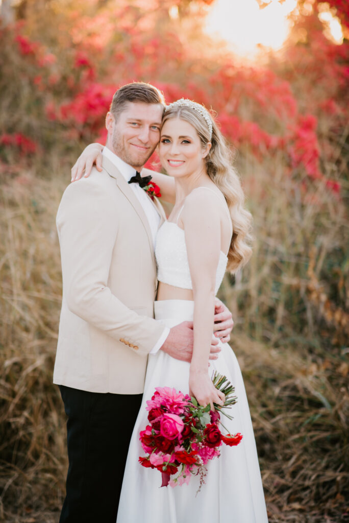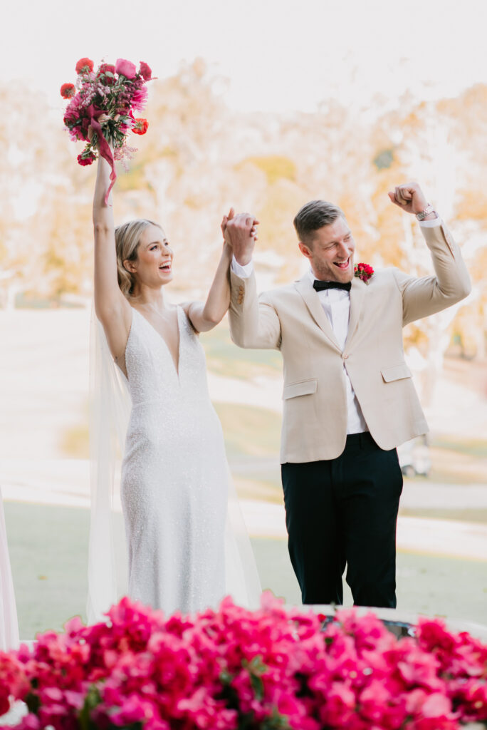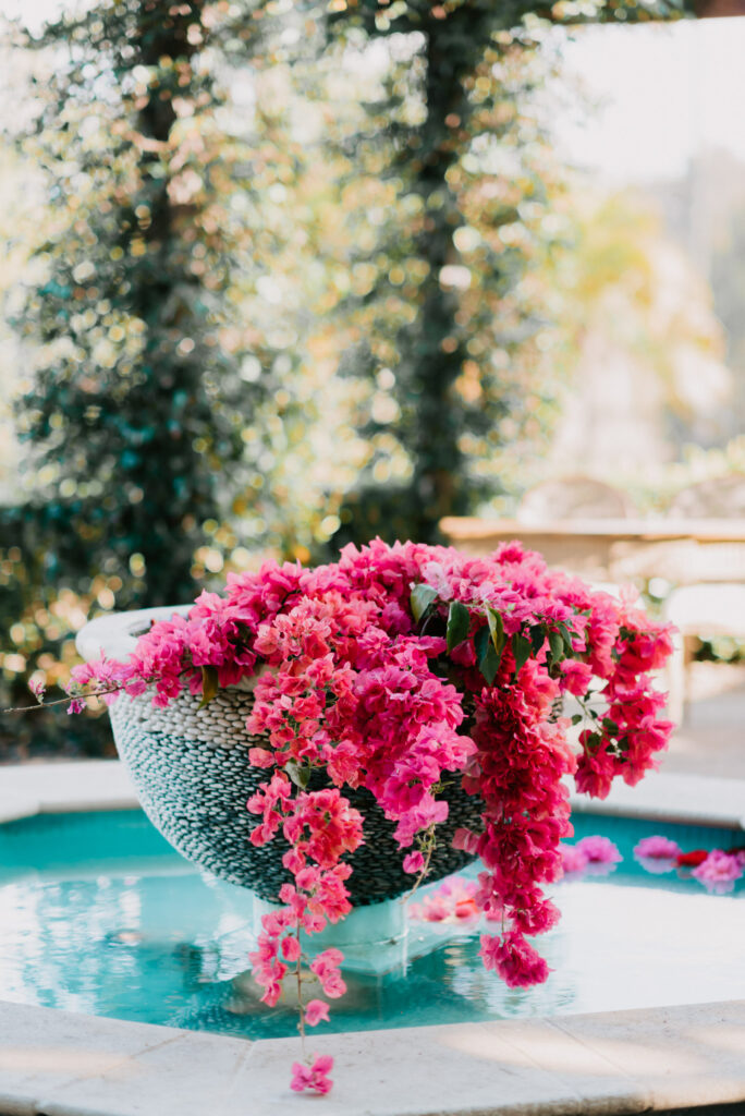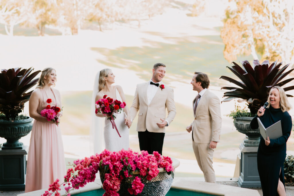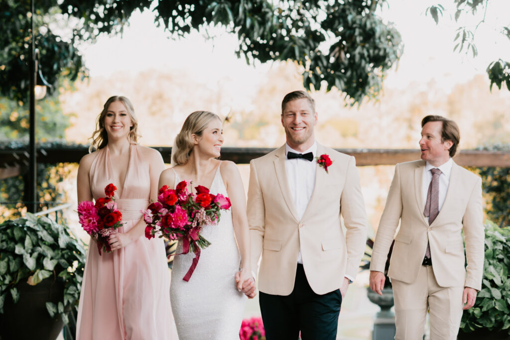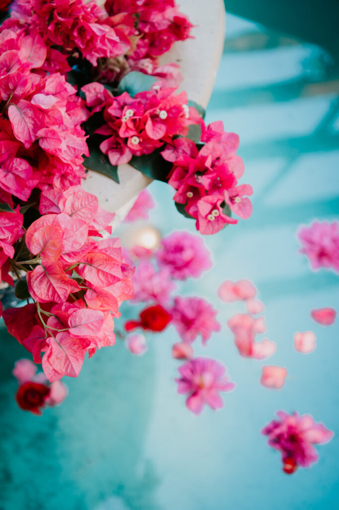 Honouring Hillstone St Lucia’s stunning seasonal pink bougainvillea within its grounds, this team was all about showcasing all things feminine, whimsical and romantic. They were also inspired by the elegance of the venue’s unique ceremony and reception spaces. The bride and bridesmaid were dressed in modern and sophisticated beaded gowns sourced from local designer, When Freddie Met Lilly. Their look was adorned with stunning headpieces by The Little Pack of Five. Hair and makeup artist, Bella Brides created a soft and romantic look that embodied the elegance of the shoot. The groom and groomsmen were impeccably dressed in cream suits, also by When Freddie Met Lilly. Held at the Fountain area, the ceremony space was adjourned with pink bougainvillea which cascaded down the fountain and into the water. The bridal party was framed by a stunning collection of blooms with bright pink and red tones. Brisbane City Celebrants brought a beautiful energy and elegance to the ceremony.After the ceremony, the bridal party enjoyed some champagne fun wandering the grounds amongst the wall of bougainvillea. Afterwards, Emunah Events designed a romantic and elegant reception space at The Mango Tree Terrace. It included a beautifully adorned long table under the tree, complete with fairy lights and candles, a pastel floral runner, gold cutlery and gold trim dinnerware. It was a feast for the eyes! The stunning three tier wedding cake, by The Sweet Society Co, was simply striking and adorned with hand made pink bougainvillea petals.We Are Twine’s light and bright imagery was captured with a modern and joyful romance. The team was able to honour the stunning spaces at Hillstone St Lucia along side it’s homage to the pink bougainvillea featured at this time of year.