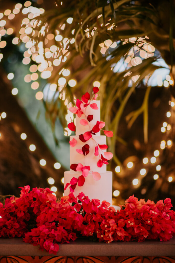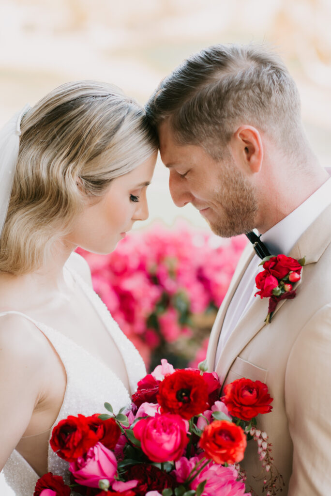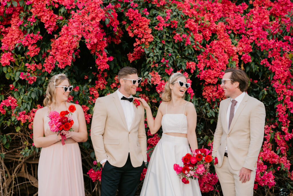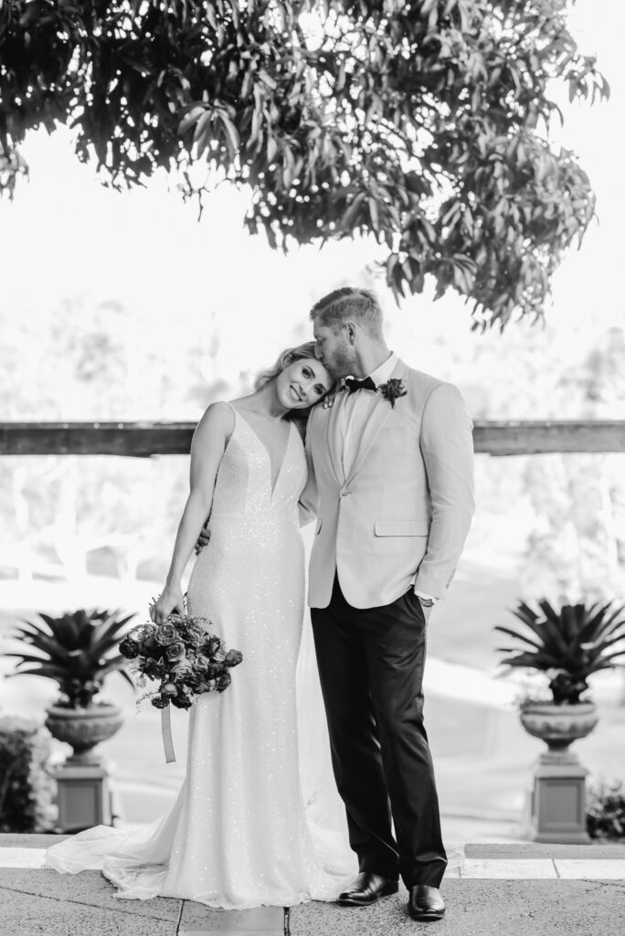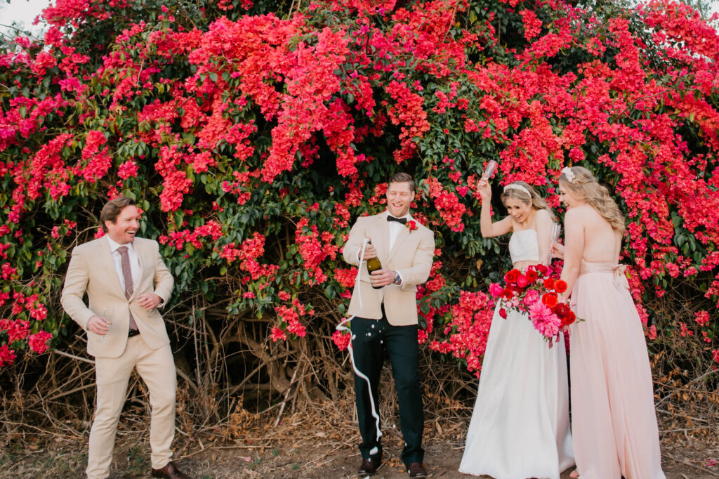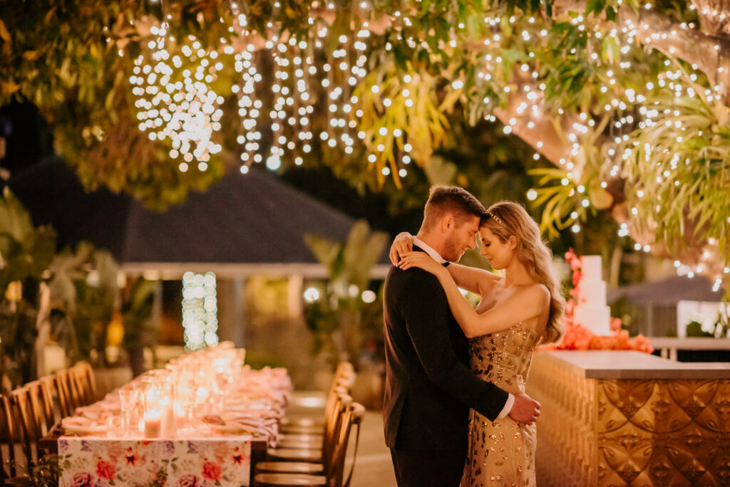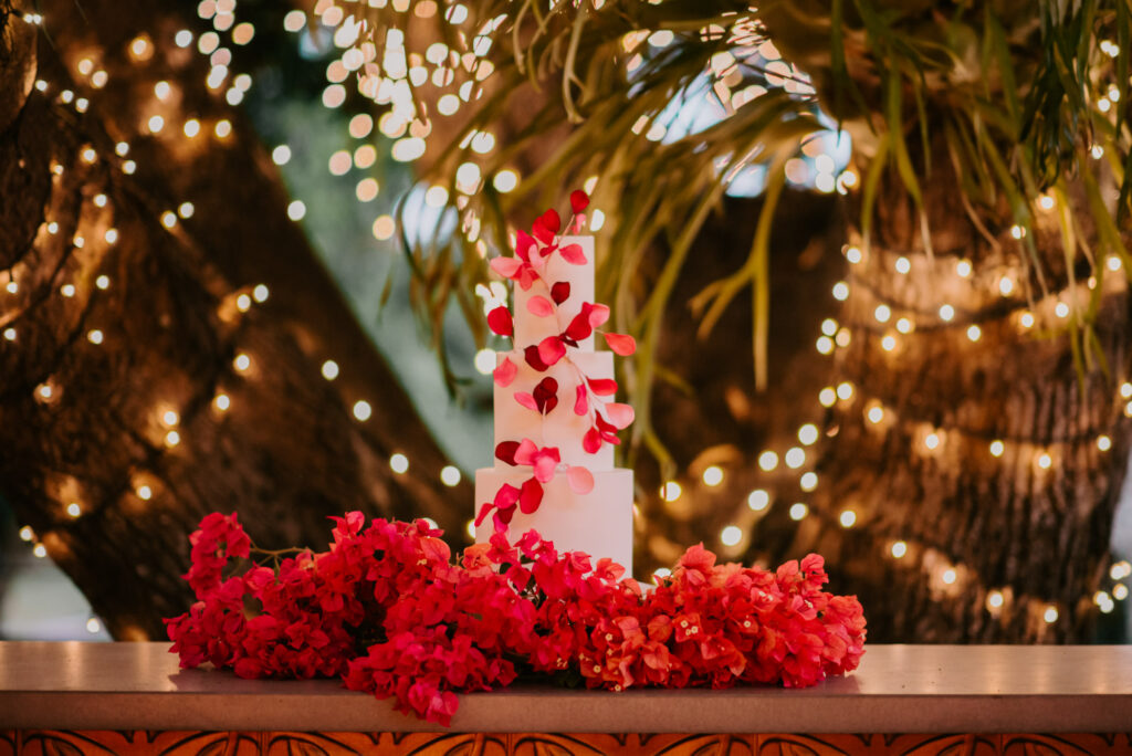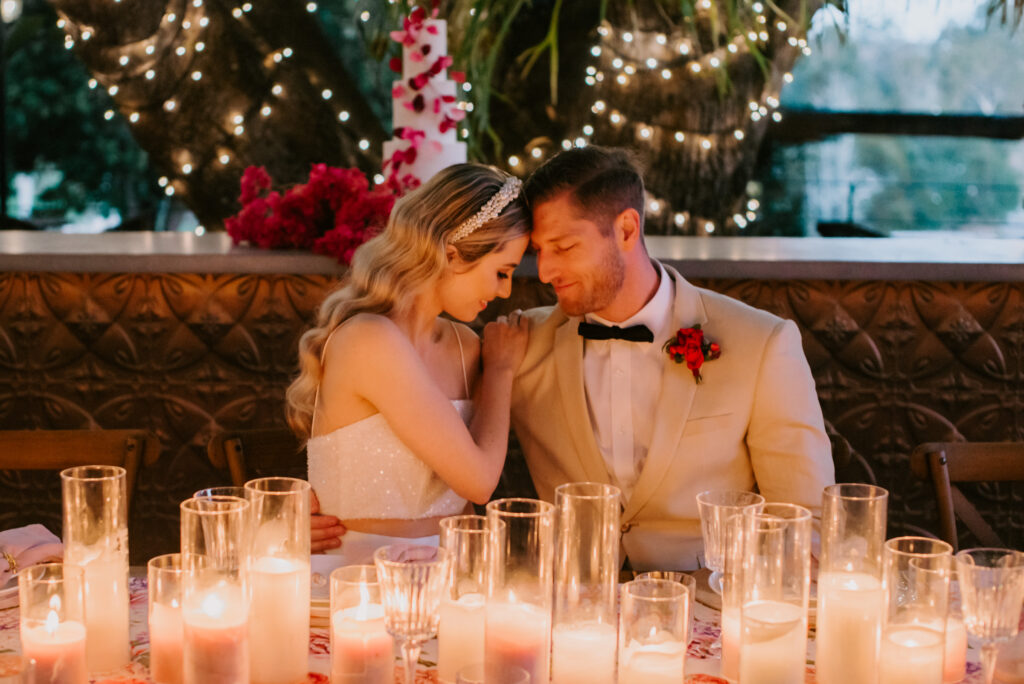 Honouring Hillstone St Lucia’s stunning seasonal pink bougainvillea within its grounds, this team was all about showcasing all things feminine, whimsical and romantic. They were also inspired by the elegance of the venue’s unique ceremony and reception spaces. The bride and bridesmaid were dressed in modern and sophisticated beaded gowns sourced from local designer, When Freddie Met Lilly. Their look was adorned with stunning headpieces by The Little Pack of Five. Hair and makeup artist, Bella Brides created a soft and romantic look that embodied the elegance of the shoot. The groom and groomsmen were impeccably dressed in cream suits, also by When Freddie Met Lilly. Held at the Fountain area, the ceremony space was adjourned with pink bougainvillea which cascaded down the fountain and into the water. The bridal party was framed by a stunning collection of blooms with bright pink and red tones. Brisbane City Celebrants brought a beautiful energy and elegance to the ceremony.After the ceremony, the bridal party enjoyed some champagne fun wandering the grounds amongst the wall of bougainvillea. Afterwards, Emunah Events designed a romantic and elegant reception space at The Mango Tree Terrace. It included a beautifully adorned long table under the tree, complete with fairy lights and candles, a pastel floral runner, gold cutlery and gold trim dinnerware. It was a feast for the eyes! The stunning three tier wedding cake, by The Sweet Society Co, was simply striking and adorned with hand made pink bougainvillea petals.We Are Twine’s light and bright imagery was captured with a modern and joyful romance. The team was able to honour the stunning spaces at Hillstone St Lucia along side it’s homage to the pink bougainvillea featured at this time of year.