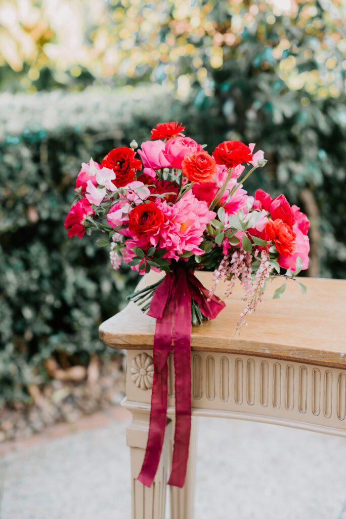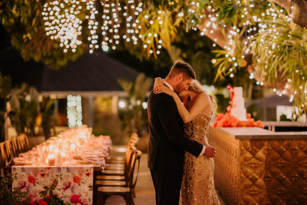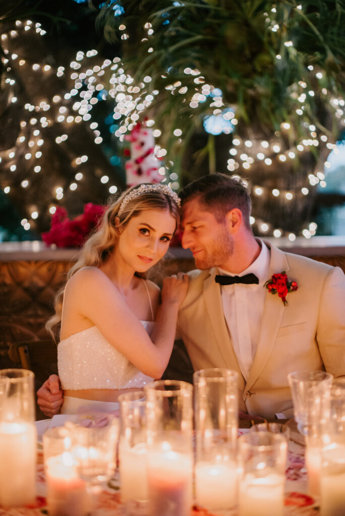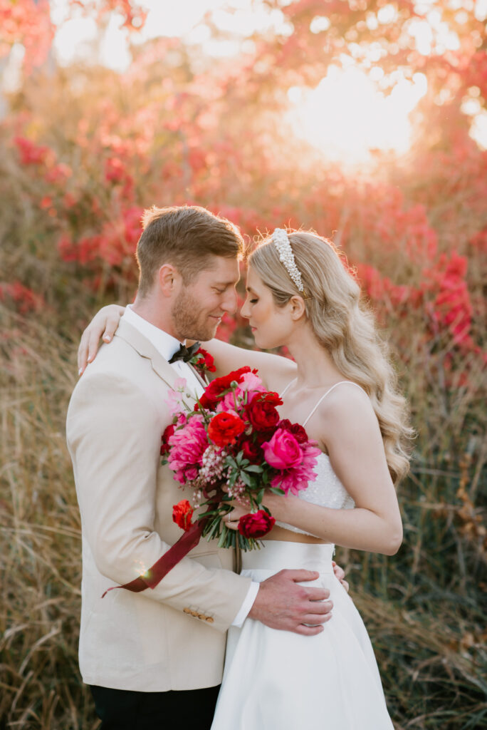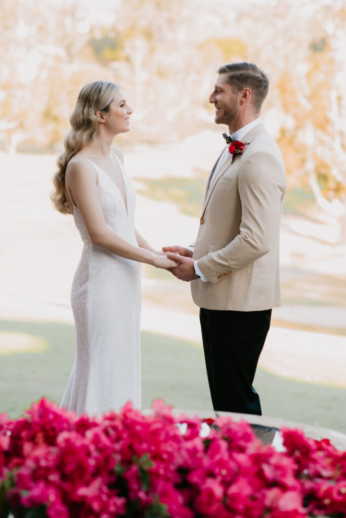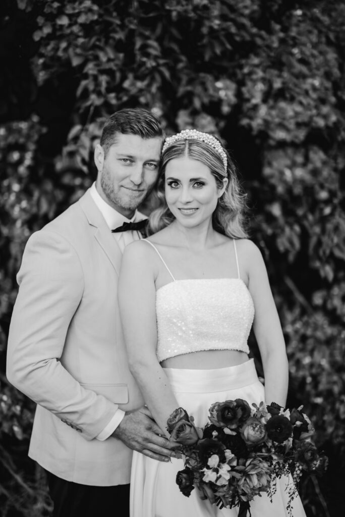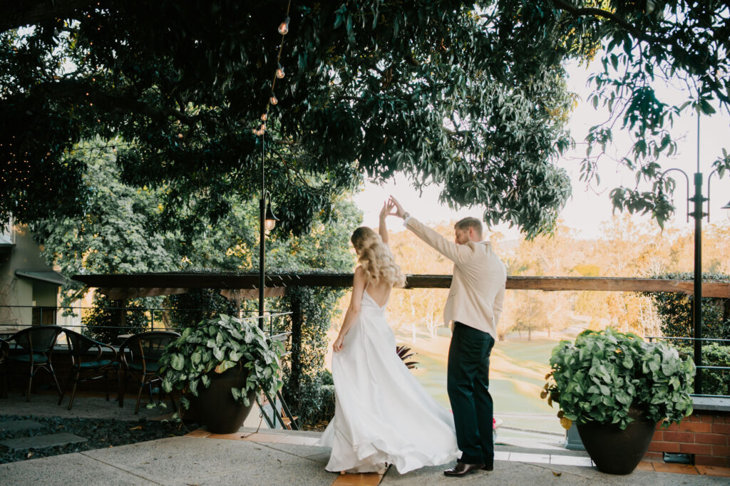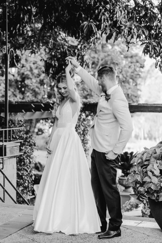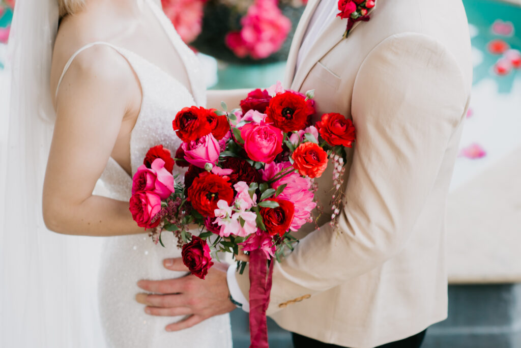 Honouring Hillstone St Lucia’s stunning seasonal pink bougainvillea within its grounds, this team was all about showcasing all things feminine, whimsical and romantic. They were also inspired by the elegance of the venue’s unique ceremony and reception spaces. The bride and bridesmaid were dressed in modern and sophisticated beaded gowns sourced from local designer, When Freddie Met Lilly. Their look was adorned with stunning headpieces by The Little Pack of Five. Hair and makeup artist, Bella Brides created a soft and romantic look that embodied the elegance of the shoot. The groom and groomsmen were impeccably dressed in cream suits, also by When Freddie Met Lilly. Held at the Fountain area, the ceremony space was adjourned with pink bougainvillea which cascaded down the fountain and into the water. The bridal party was framed by a stunning collection of blooms with bright pink and red tones. Brisbane City Celebrants brought a beautiful energy and elegance to the ceremony.After the ceremony, the bridal party enjoyed some champagne fun wandering the grounds amongst the wall of bougainvillea. Afterwards, Emunah Events designed a romantic and elegant reception space at The Mango Tree Terrace. It included a beautifully adorned long table under the tree, complete with fairy lights and candles, a pastel floral runner, gold cutlery and gold trim dinnerware. It was a feast for the eyes! The stunning three tier wedding cake, by The Sweet Society Co, was simply striking and adorned with hand made pink bougainvillea petals.We Are Twine’s light and bright imagery was captured with a modern and joyful romance. The team was able to honour the stunning spaces at Hillstone St Lucia along side it’s homage to the pink bougainvillea featured at this time of year.
