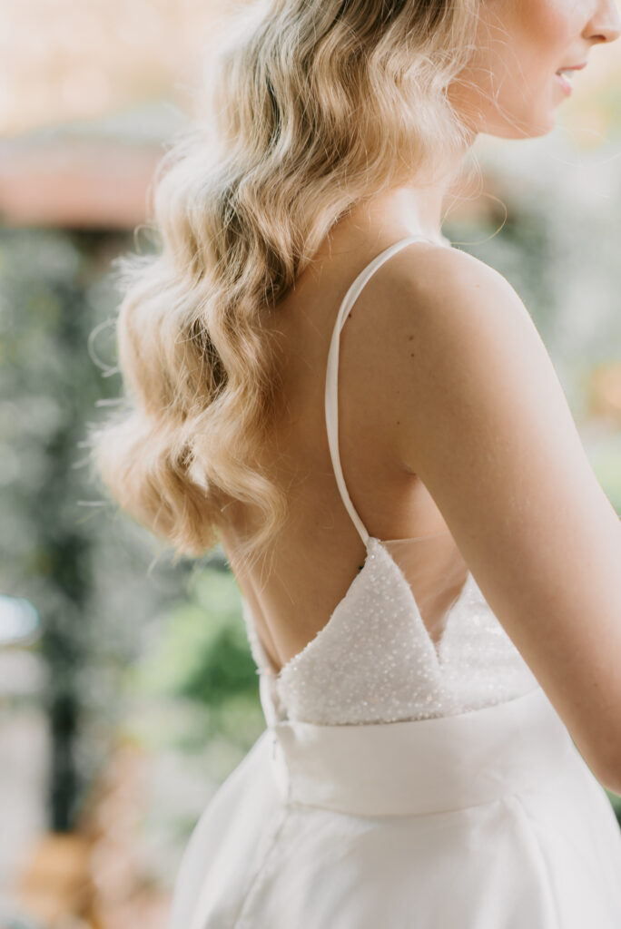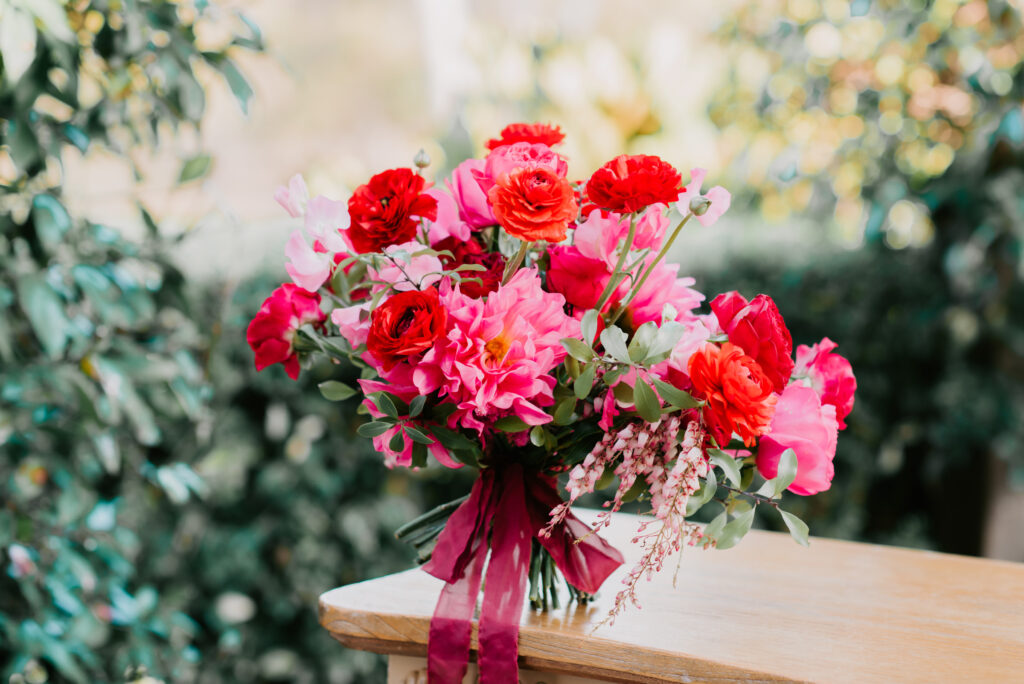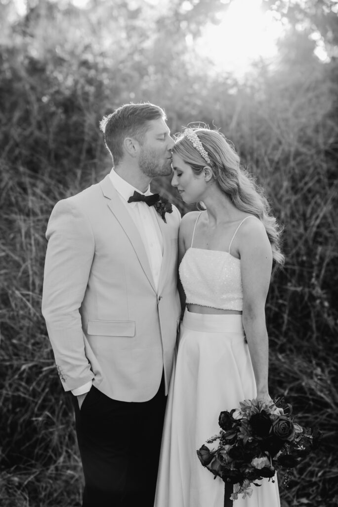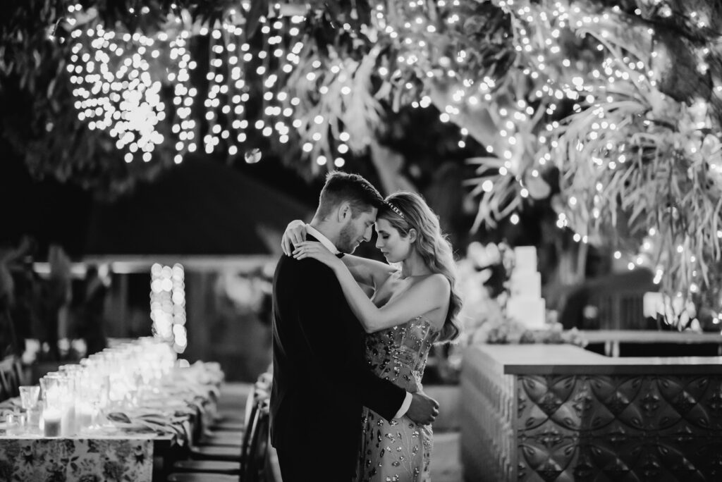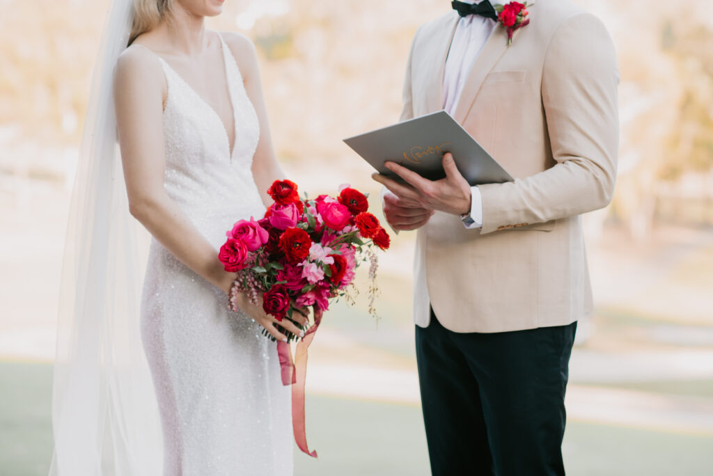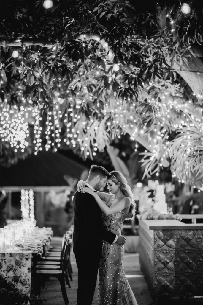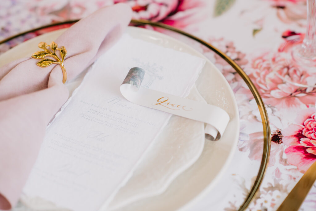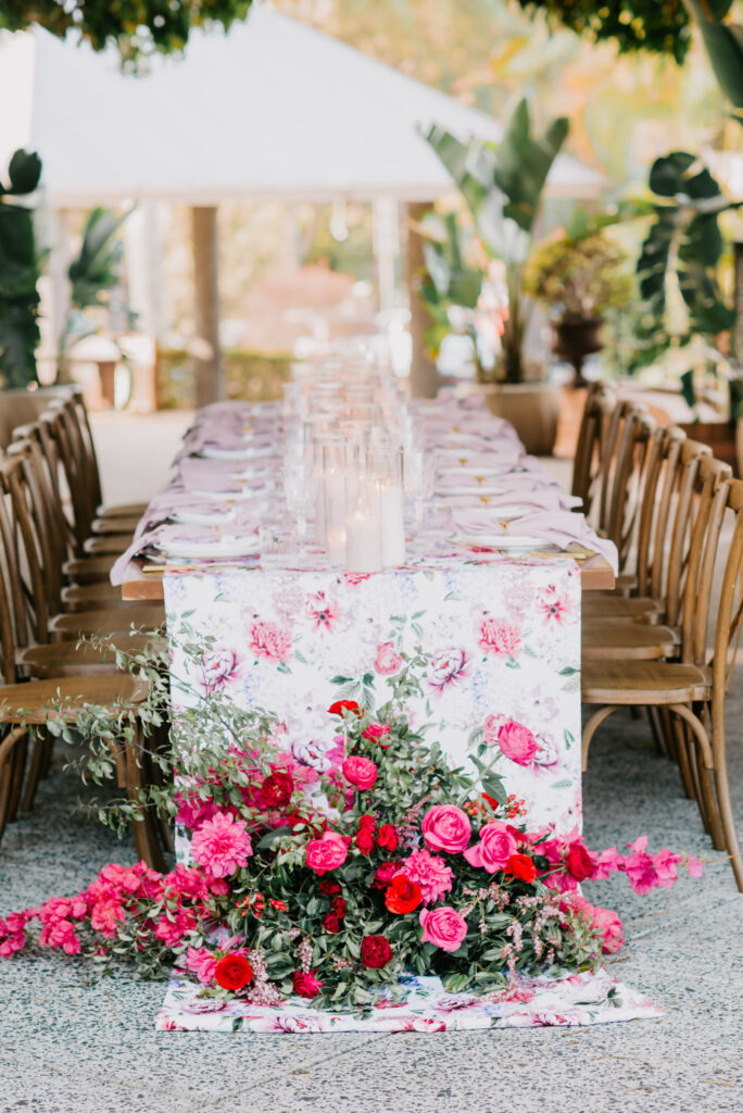 Honouring Hillstone St Lucia’s stunning seasonal pink bougainvillea within its grounds, this team was all about showcasing all things feminine, whimsical and romantic. They were also inspired by the elegance of the venue’s unique ceremony and reception spaces. The bride and bridesmaid were dressed in modern and sophisticated beaded gowns sourced from local designer, When Freddie Met Lilly. Their look was adorned with stunning headpieces by The Little Pack of Five. Hair and makeup artist, Bella Brides created a soft and romantic look that embodied the elegance of the shoot. The groom and groomsmen were impeccably dressed in cream suits, also by When Freddie Met Lilly. Held at the Fountain area, the ceremony space was adjourned with pink bougainvillea which cascaded down the fountain and into the water. The bridal party was framed by a stunning collection of blooms with bright pink and red tones. Brisbane City Celebrants brought a beautiful energy and elegance to the ceremony.After the ceremony, the bridal party enjoyed some champagne fun wandering the grounds amongst the wall of bougainvillea. Afterwards, Emunah Events designed a romantic and elegant reception space at The Mango Tree Terrace. It included a beautifully adorned long table under the tree, complete with fairy lights and candles, a pastel floral runner, gold cutlery and gold trim dinnerware. It was a feast for the eyes! The stunning three tier wedding cake, by The Sweet Society Co, was simply striking and adorned with hand made pink bougainvillea petals.We Are Twine’s light and bright imagery was captured with a modern and joyful romance. The team was able to honour the stunning spaces at Hillstone St Lucia along side it’s homage to the pink bougainvillea featured at this time of year.